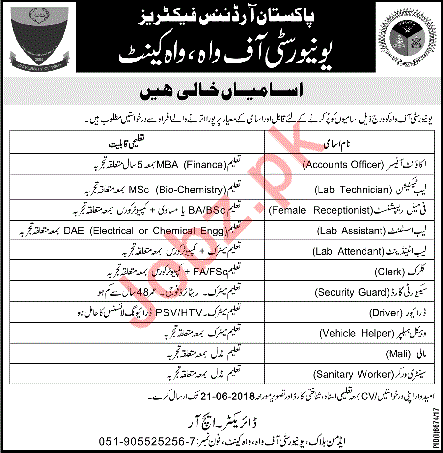 University of Wah UOW, Pakistan Ordnance Factories POF, Pakistan Army, Government of Pakistan required candidates for the posts of Accounts Officer, Lab Technician, Female Receptionist, Lab Assistant, Lab Attendant, Clerk, Security Guard, LTV/ PSV Driver, Vehicle Helper, Mali and Sanitary Worker.