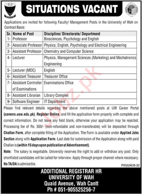 University of Wah jobs advertisement dated about 11 December 2022 in daily The News Newspaper invites application for the vacant post of professor, lecturer, assistant controller of examination, assistant trasurer, software engineer, associate professor, assistant professor and assistant librarian in Wah Cantt, wah cantt Punjab Pakistan. Preferred Education is Phd, Mphil and MS etc.