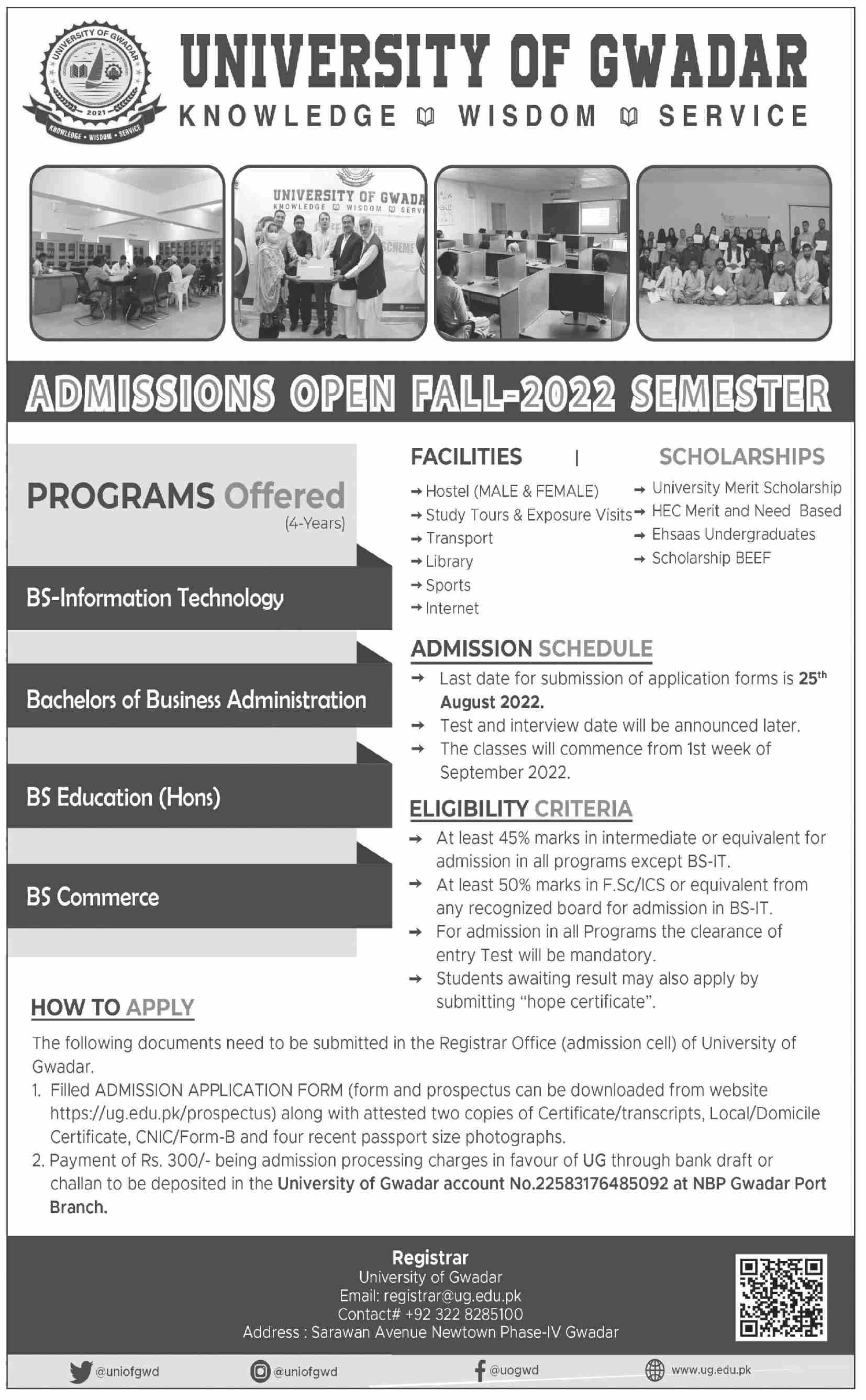 University Of Gwadar BS in Information Technology, BS Education Hons, BS commerce, BBA Bachelor of Business Administration, admissions 2022 has been announced. Eligible students who qualify as per admission criteria in University Of Gwadar Gwadar Balochistan Pakistan can apply in Science University for academic year 2022. Students who want to enroll for academic session 2022 in BBA and BS qualification and admission criteria for Government institute can apply till last date 25 August 2022. Read newspaper ad for exact details.