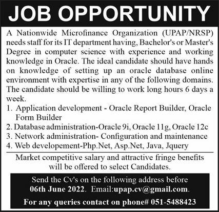 Vacant posts including dot net developer, application development, oracle form builder, database administrator, web developer, network administration, jquery developer, oracle developer, oracle report builder, php developer, oracle databse administrator, java developer and asp dot net developer are announced in UPAP NRSP Organization Islamabad, islamabad Islamabad Pakistan as per 31 May 2022 advertisement in daily Express Newspaper. Preferred Education is Master, Others, Bachelor, BCS and BIT etc.