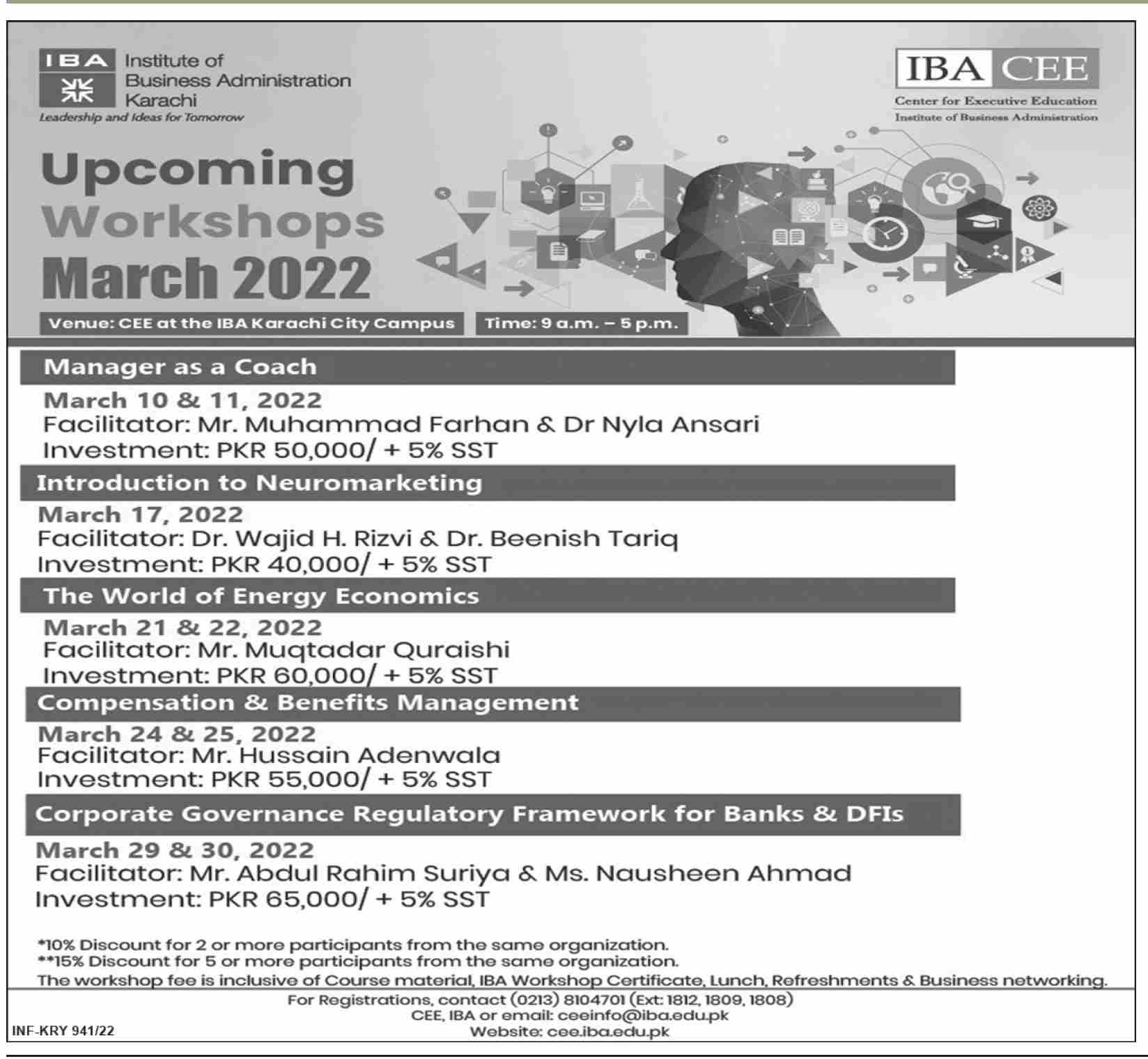 Institute of Business Administration IBA Manager as a Coach Introduction to Neuromarketing, The World of Energy Economics, Compensation and Benefits Management, Corporate Governance Regulatory Framework for Bank and DFIs admissions 2022 has been started. Students can enroll for admissions in Institute of Business Administration IBA Karachi Sindh Pakistan for academic year 2022 to continue campus based or online education in Other Course. Students who want to enroll for academic session 2022 in Course qualification and admission criteria for Government institute can apply till last date 5 March 2022. Read newspaper ad for exact details.