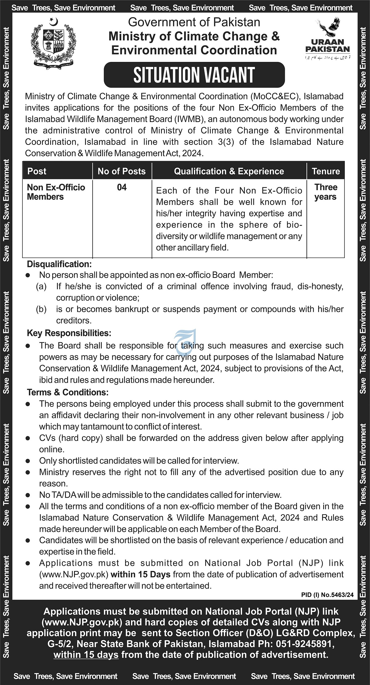 Ministry of Climate Change Islamabad, islamabad Islamabad Pakistan invites applications from eligible candidates for the post of non ex officio member as per advertisement of February 13, 2025 published in daily Aaj Newspaper. Educational qualifications required Master and Bachelor etc.