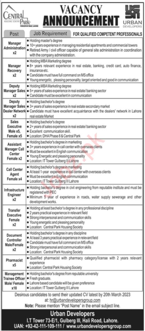 Urban Developers jobs advertisement dated about 12 March 2023 in daily Jang Newspaper invites application for the vacant post of transfer executive, assistant manager call center, management trainee officer, deputy manager sales, document controller, manager administration, manager recovery, infrastructure engineer, call center agent, pharmacist, deputy manager sales dealer network and sales executive in Lahore, lahore Punjab Pakistan. Candidates with Intermediate, Master and Bachelor etc. educational background will be preferred.
