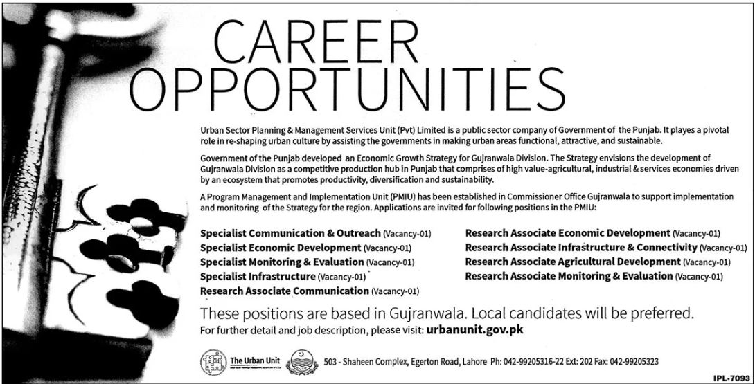 Urban Sector Planning and Management Services Private Limited is hiring Specialist Communication and Outreach, Specialist Economic Development, Specialist Monitoring and Evaluation, Research Associate Communication, Research Associate Economic Development, Research Associate Infrastructure and Connectivity, Research Associate Agricultural Development, Research Associate Monitoring and Evaluation in Gujranwala.