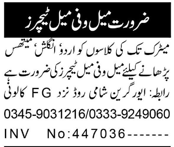 Private School jobs advertisement dated about 13 November 2025 in daily Aaj Newspaper invites application for the vacant post of urdu teacher, english teacher, teacher, mathematics teacher and female teacher in Shami Road Peshawar, peshawar Khyber Pakhtunkhwa KPK Pakistan. Master and Bachelor etc. educational qualification will be preferred.