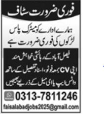 Vacant posts including male staff are announced in Private Company Faisalabad, faisalabad Punjab Pakistan as per 23 June 2025 advertisement in daily Kawish Newspaper. Candidates with Matric etc. educational background will be preferred.