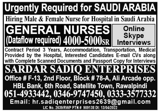 Sardar Sadiq Enterprises latest Overseas Medical jobs and others can be applied till 11 September 2022 or as per closing date in newspaper ad. Read complete ad online to know how to apply on latest Sardar Sadiq Enterprises job opportunities. Overtime is allowed. Employer provides accommodation and food facility.