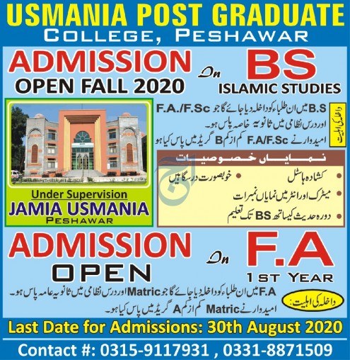 Usmania Post Graduate College has announced admission in Intermediate, FA and Bachelor of Science BS Islamic Studies in Peshawar Khyber Pakhtunkhwa KPK 2020. Read newspaper ad for exact details.