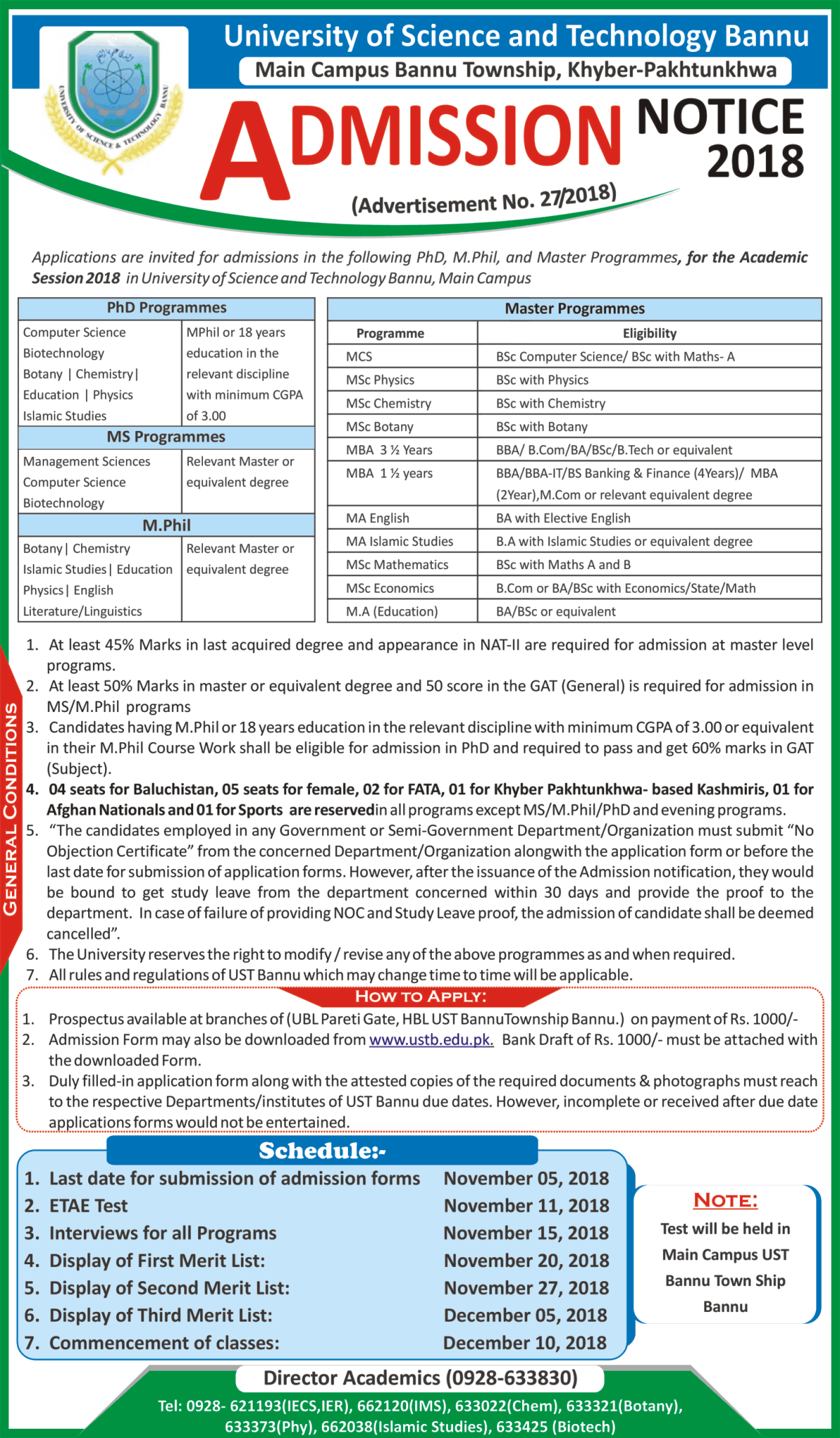University of Science and Technology Bannu USTB, Pakistan are started admissions fall 2018 for the classes of MA, MSc, MCs, MA, MBA, M Phil, MS Programs & PhD Programs. Read newspaper ad for exact details.