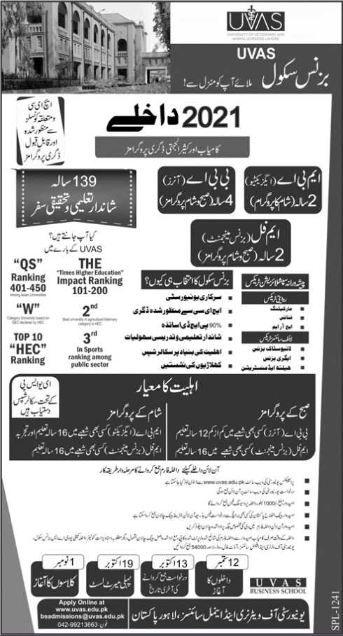 UVAS Business School, University of Veterinary and Animal Sciences UVAS Lahore invites applications from eligible and interested candidates for admissions in BBA, MBA and M.Phil Programs Read newspaper ad for exact details.
