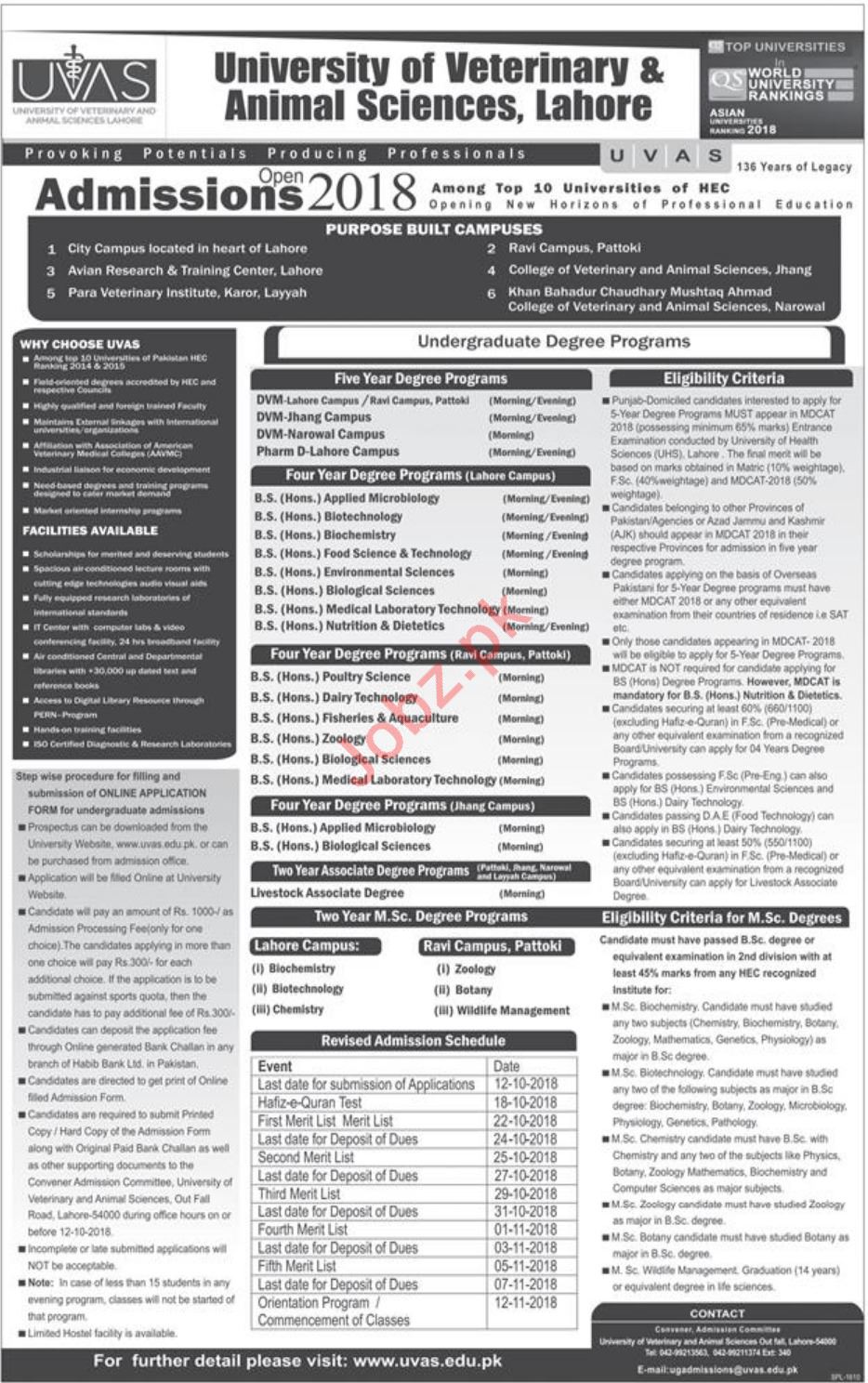 University of Veterinary and Animal Sciences UVAS is offering admissions for Doctor of Veterinary Medicine DVM, Pharm-D, BS Hons, Undergraduate Degree Programs 2018 in Lahore Punjab. Read newspaper ad for exact details.