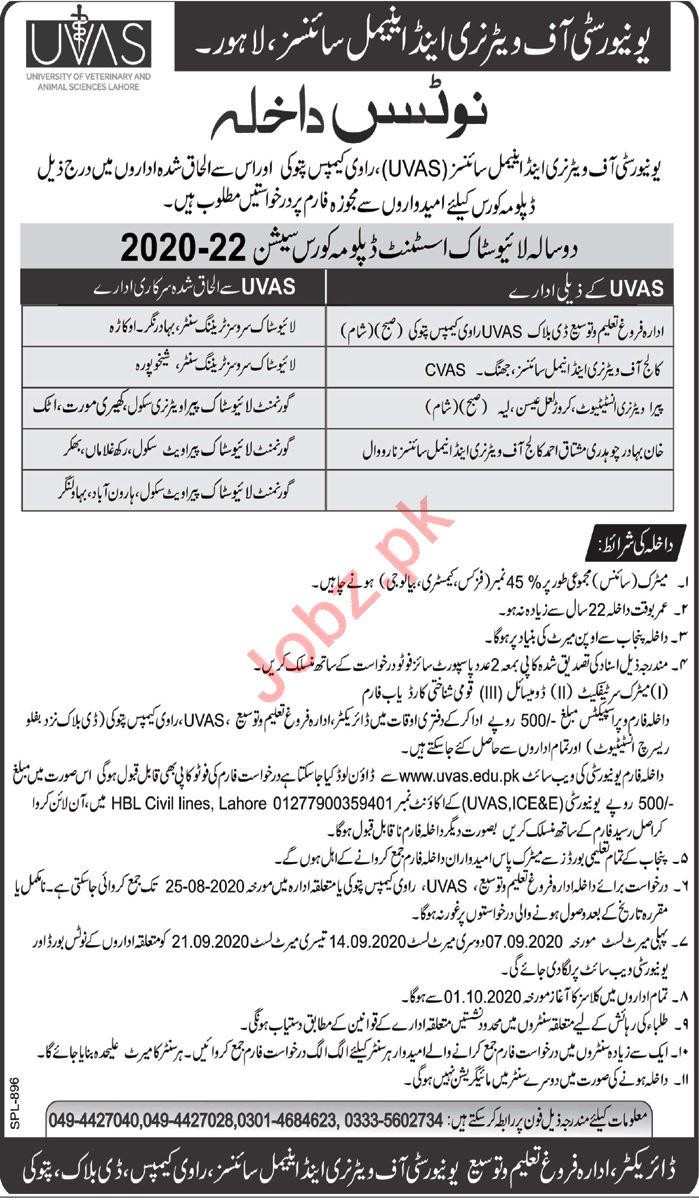 University of Veterinary and Animal Sciences UVAS Lahore, Pakistan is announcing admissions fall 2020 for the classes of Livestock Assistant Diploma Course 2 Years. Read newspaper ad for exact details.