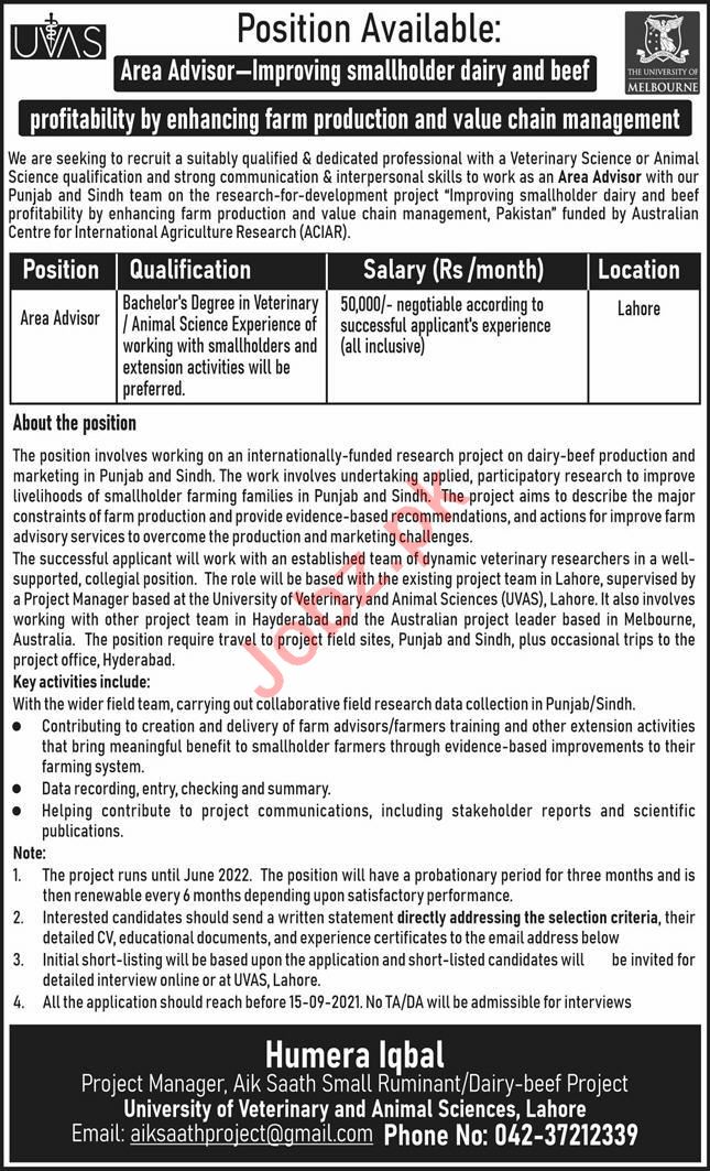 UVAS University Lahore Jobs 2021 For Area Advisor