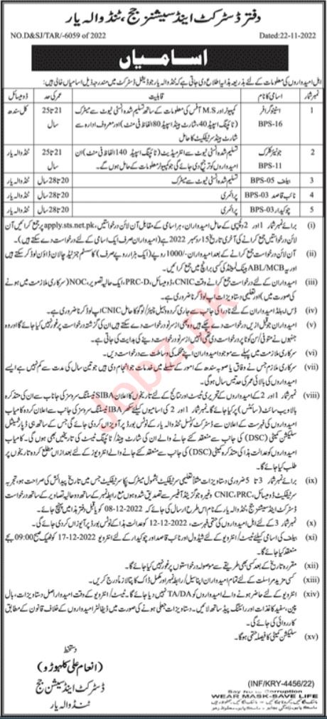 District & Session Judge Tando Allahyar, tando allahyar Sindh Pakistan invites applications from eligible candidates for the post of stenographer, bailiff, clerk, naib qasid and chowkidar as per advertisement of November 27, 2022 published in daily Jang Newspaper. Persons with Intermediate, Matric and Primary etc. education can apply.