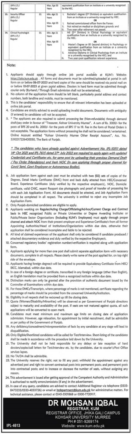 Vacancies in Kohsar University Advertisement June 2023