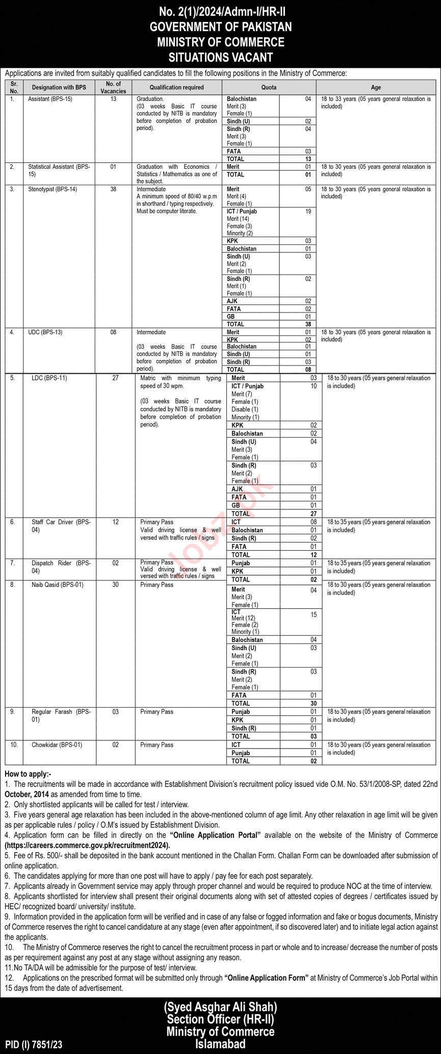 Ministry of Commerce Islamabad, islamabad Islamabad Pakistan invites applications from eligible candidates for the post of dispatch rider, staff car driver, naib qasid, stenotypist, farash, statistical assistant, ldc, assistant, chowkidar and udc as per advertisement of June 16, 2024 published in daily Express Newspaper. Candidates with Bachelor, Matric, Primary and Intermediate etc. educational background will be preferred.