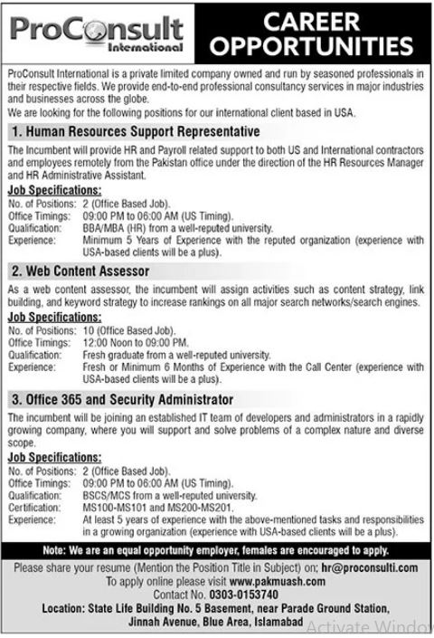 Proconsult International Islamabad, islamabad Islamabad Pakistan invites applications from eligible candidates for the post of human resources support representative, web content assessor and office security administrator as per advertisement of April 10, 2022 published in daily The News Newspaper. Preferred Education is Bachelor, BCS, MCS, BBA and MBA etc.