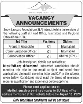 Snow Leopard Foundation SLF is looking for candidates for following posts as per job advertisement published in daily Jang Newspaper of August 4, 2023 for location Islamabad, chitral and islamabad Islamabad Pakistan: