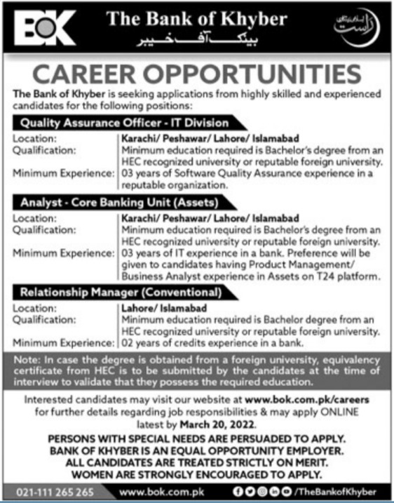 Vacancies in The Bank of Khyber BOK Advertisement March 2022