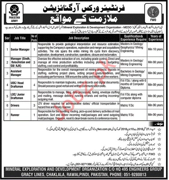 Latest Frontier Works Organization FWO Management Posts Rawalpindi 2025