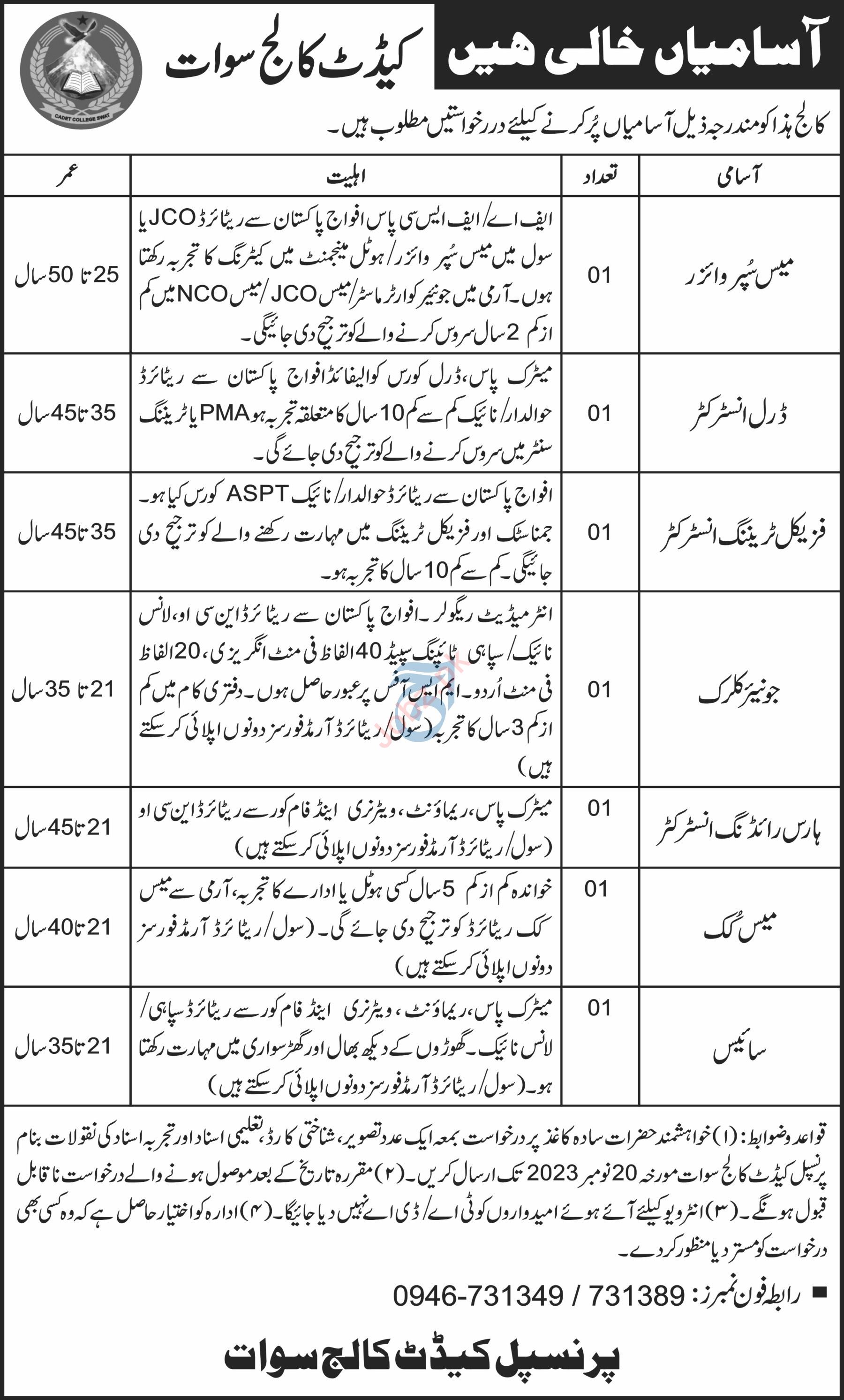 Cadet College is looking for candidates for following posts as per job advertisement published in daily Aaj Newspaper of November 5, 2023 for location Swat, swat Khyber Pakhtunkhwa KPK Pakistan: