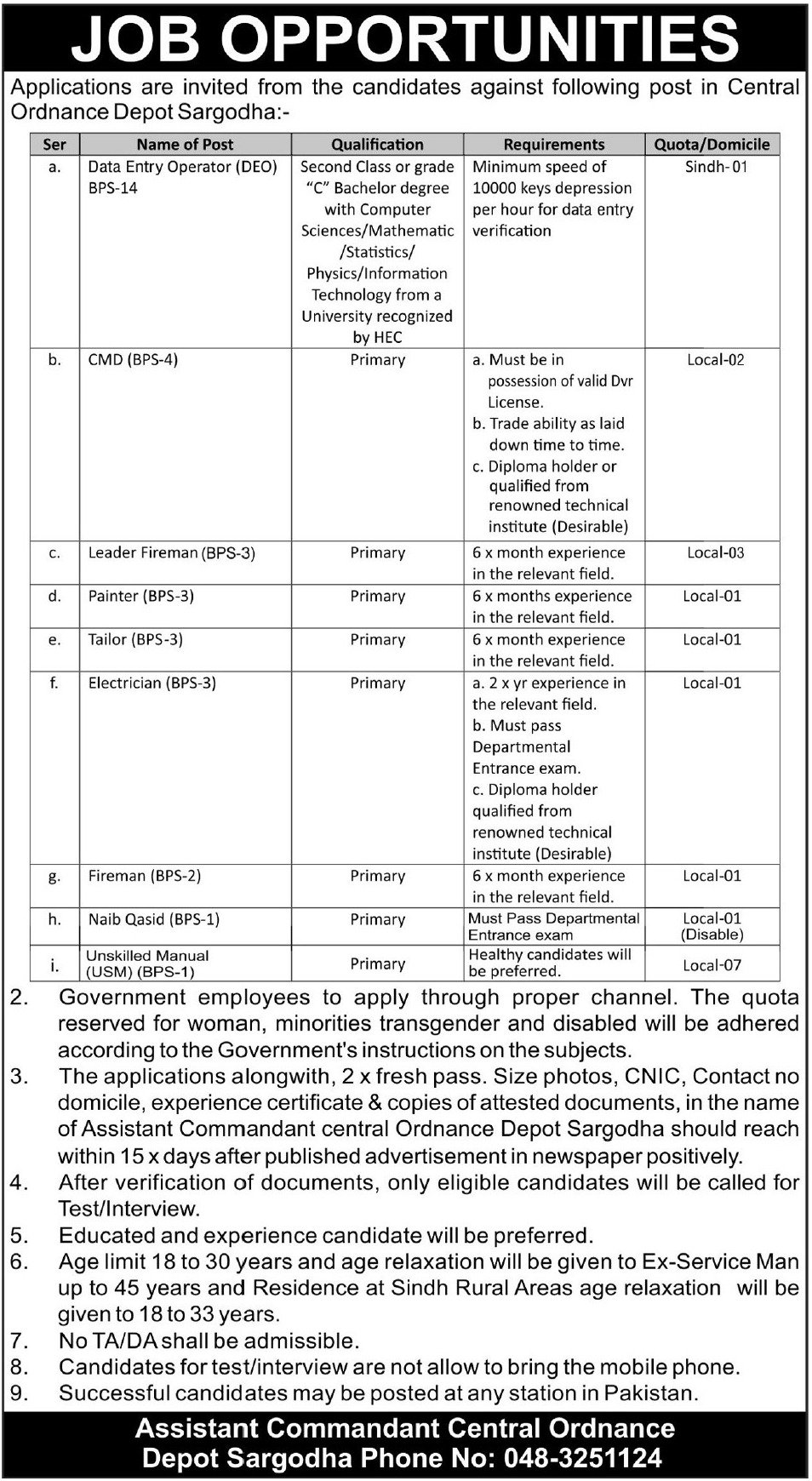 Central Ordnance Depot COD jobs advertisement dated about 12 November 2023 in daily Express Tribune Newspaper invites application for the vacant post of fireman, unskilled manual labor usm, cmd, data entry operator deo, painter, electrician, tailor, leader fireman and naib qasid in Sargodha, sargodha Punjab Pakistan. Bachelor, Primary and BCS etc. educational qualification will be preferred.