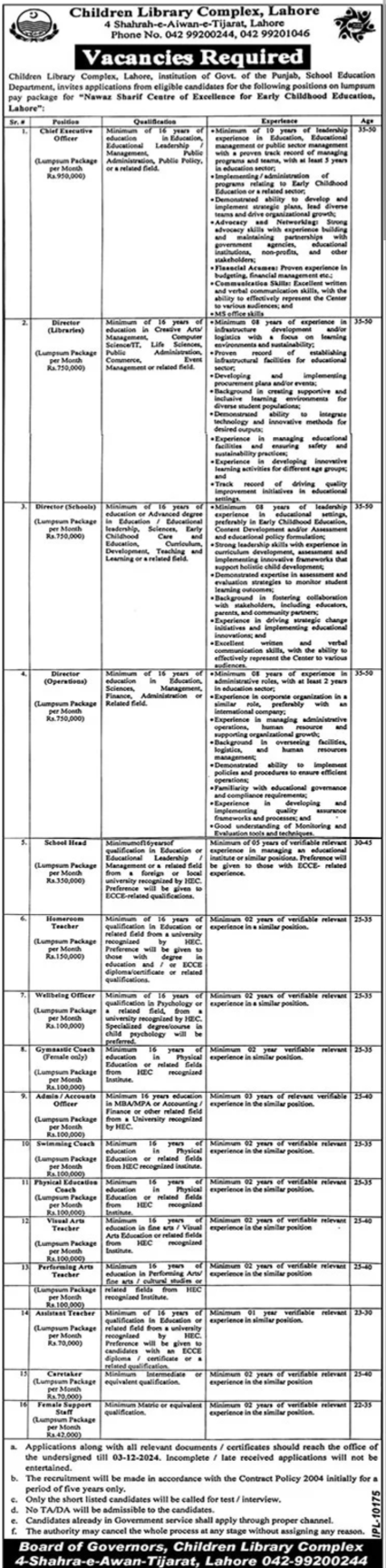 Vacancies Available At Children Library Complex Lahore