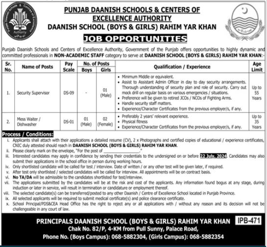Punjab Daanish Schools & Center Of Excellence Authority jobs advertisement dated about 6 July 2024 in daily Jang Newspaper invites application for the vacant post of mess waiter, dish washer and security supervisor in Rahim Yar Khan, rahim yar khan Punjab Pakistan. Preferred Education is Primary and Middle etc.