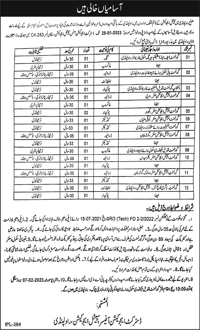 Vacant posts including cook, khakrob, conductor, chowkidar, driver and attendant are announced in Special Education Department Rawalpindi, rawalpindi Punjab Pakistan as per 12 January 2023 advertisement in daily K2 Newspaper. Candidates with Primary and Middle etc. educational background will be preferred.