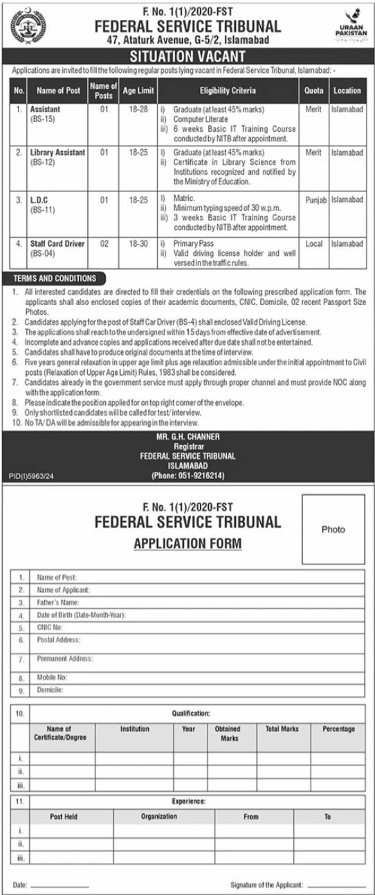 Federal Service Tribunal invites applications for job positions advertised in daily The News dated 2 March 2025 for following vacancies in G-5 Islamabad, islamabad Islamabad Pakistan.
