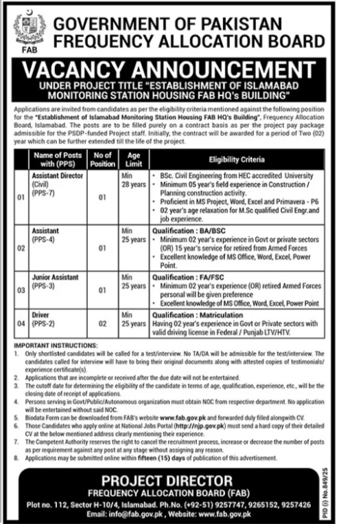 Vacant posts including assistant, driver and assistant director are announced in Frequency Allocation Board H-10 Islamabad, islamabad Islamabad Pakistan as per 3 August 2025 advertisement in daily The News Newspaper. Candidates with B.E and BA etc. educational background will be preferred.