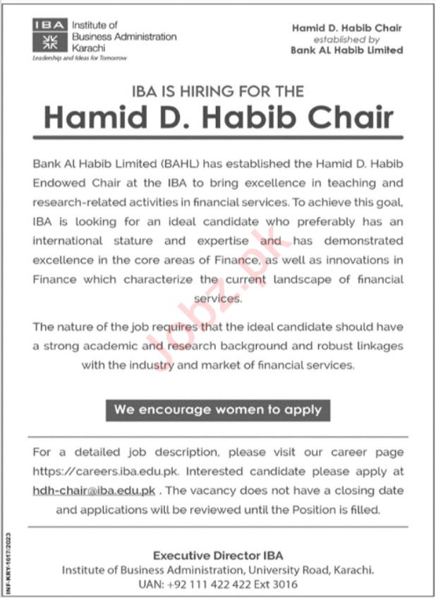 Institute of Business Administration IBA Karachi, karachi Sindh Pakistan invites applications from eligible candidates for the post of hamid d habib chair as per advertisement of April 30, 2023 published in daily Jang Newspaper. Candidates with Phd etc. educational background will be preferred.