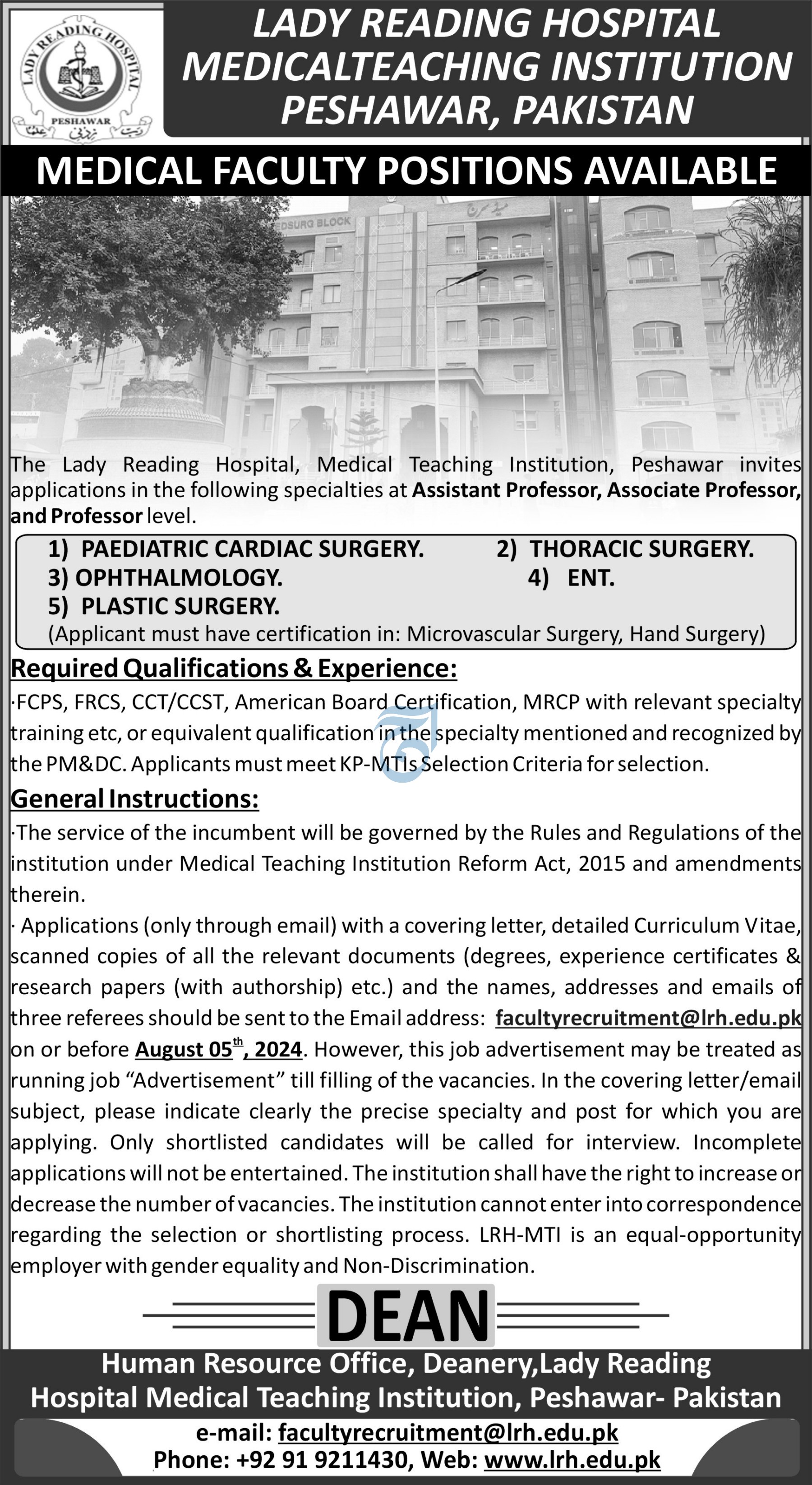 Lady Reading Hospital latest Government Education jobs and others can be applied till 5 August 2024 or as per closing date in newspaper ad. Read complete ad online to know how to apply on latest Lady Reading Hospital job opportunities.