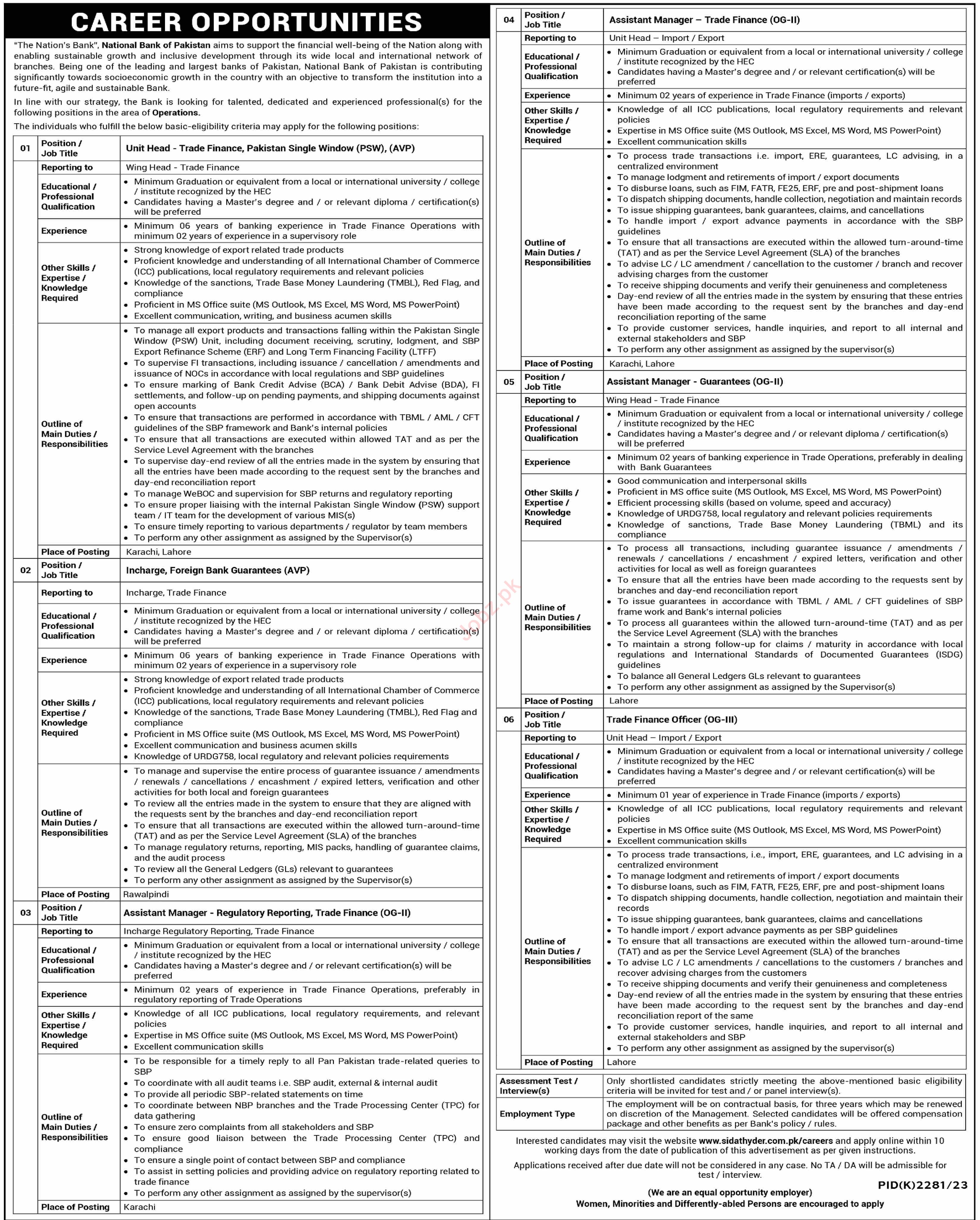 National Bank of Pakistan NBP jobs advertisement dated about 18 February 2024 in daily Dawn Newspaper invites application for the vacant post of assistant manager guarantee, assistant manager regulatory reporting, trade finance officer, unit head trade finance, incharge and assistant manager trade finance in Karachi, lahore, karachi and rawalpindi Sindh Pakistan. Candidates with Master, Bachelor and Others etc. educational background will be preferred.