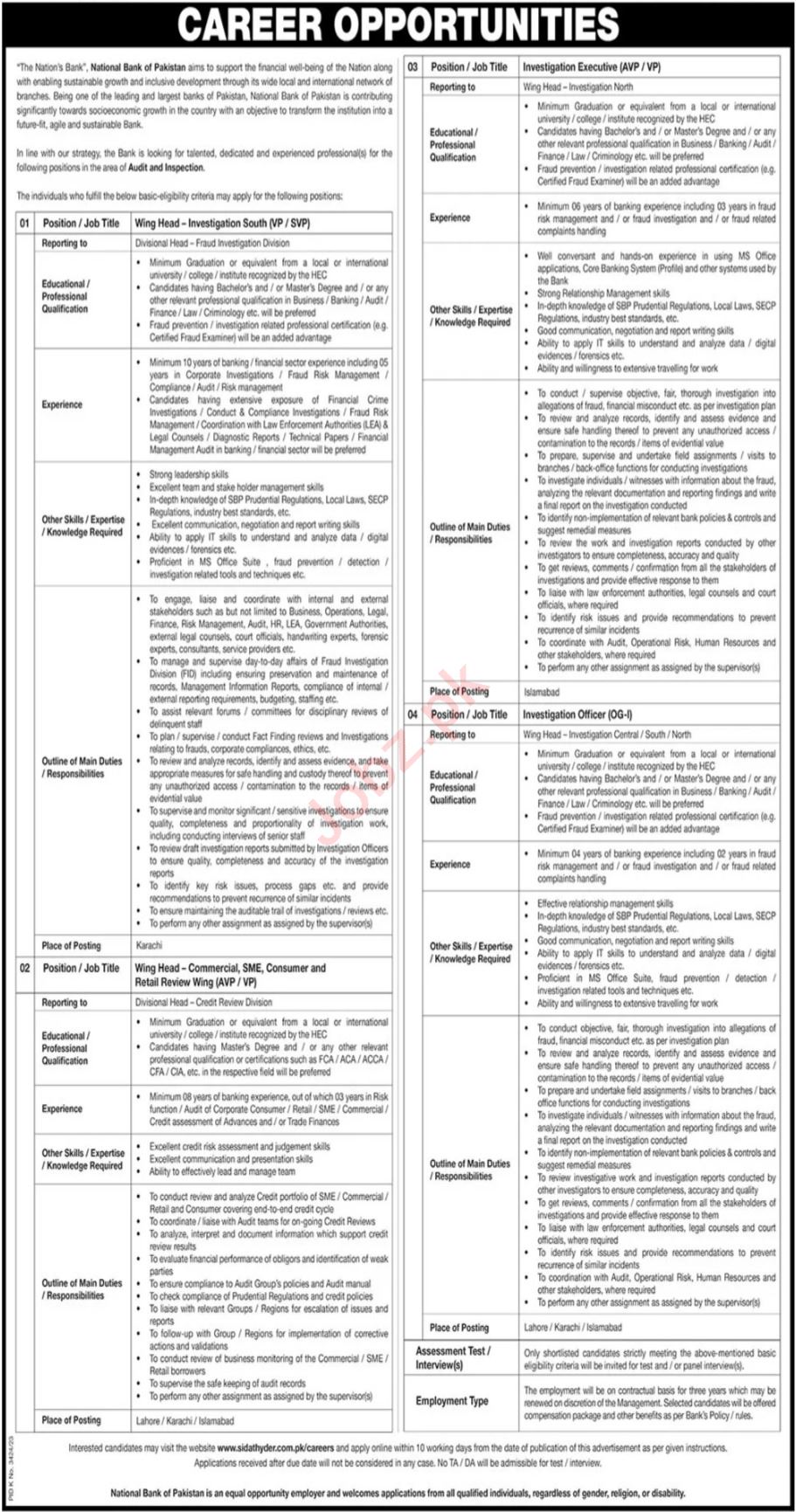 National Bank of Pakistan NBP Karachi, karachi, islamabad and lahore Sindh Pakistan invites applications from eligible candidates for the post of investigation officer, wing head and investigation executive as per advertisement of June 2, 2024 published in daily The News Newspaper. Educational qualifications required Bachelor, CA, Master and ACCA etc.