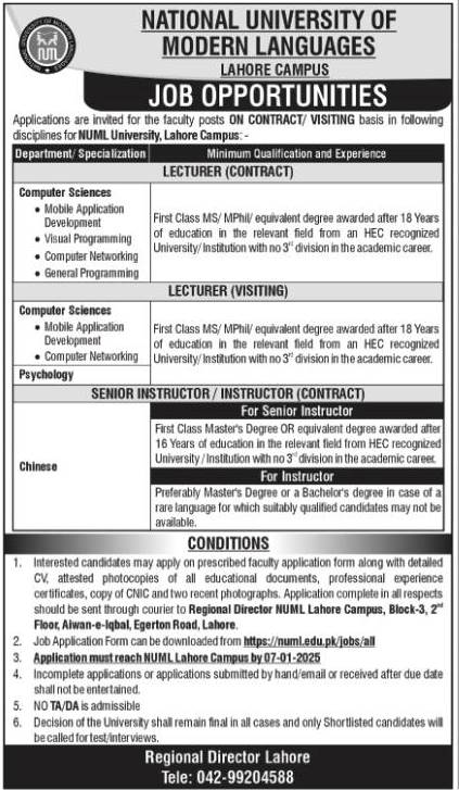 National University of Modern Languages NUML jobs advertisement dated about 1 January 2025 in daily Nation Newspaper invites application for the vacant post of visiting lecturer, lecturer and instructor in Lahore, lahore Punjab Pakistan. Educational qualifications required MS and Mphil etc.