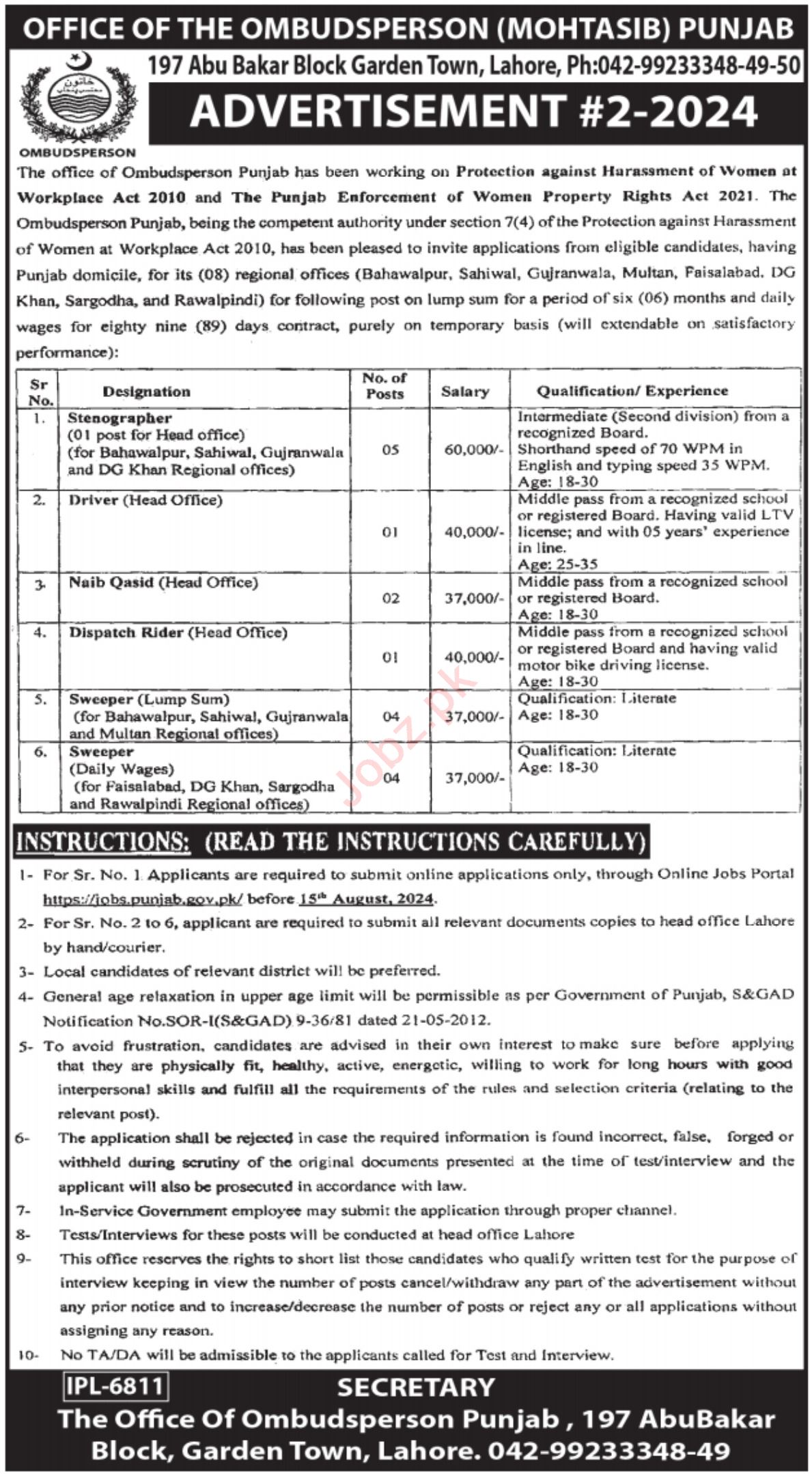 Provincial Ombudsman Mohtasib invites applications for job positions advertised in daily Express Tribune dated 21 July 2024 for following vacancies in Lahore, lahore Punjab Pakistan.