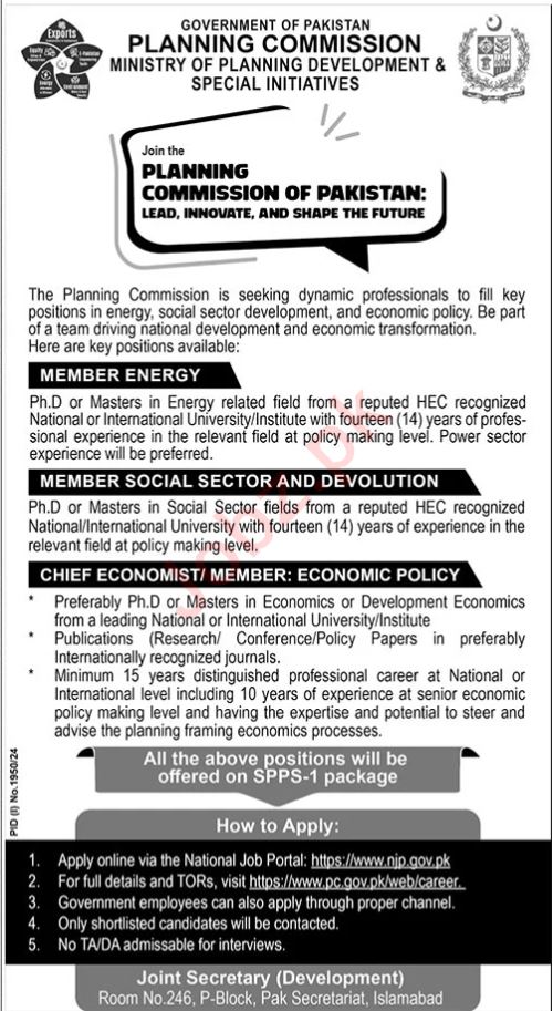 Planning Commission jobs advertisement dated about 15 September 2024 in daily The News Newspaper invites application for the vacant post of member social sector devolution, member energy, chief economist and member economic policy in Islamabad, islamabad Islamabad Pakistan. Educational qualifications required Master and Phd etc.
