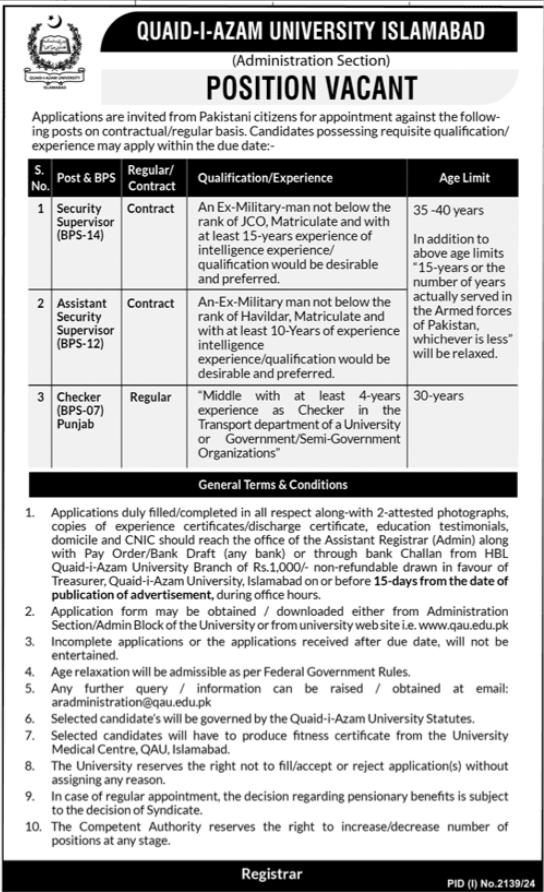 Quaid i Azam University invites applications for job positions advertised in daily Jang dated 25 September 2024 for following vacancies in Islamabad, islamabad Islamabad Pakistan.
