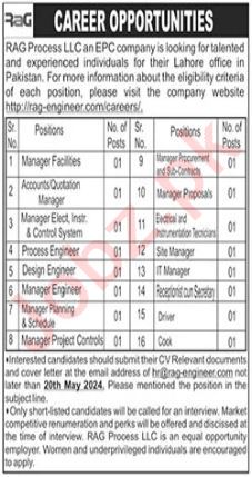 Vacant posts including it manager, manager proposal, site manager, process engineer, manager engineer, cook, manager instrumentation, manager control system, design engineer, accounts manager, manager project control, manager facilities, quotation manager, manager planning schedule, manager electrical, driver and manager procurement are announced in Private Company Lahore, lahore Punjab Pakistan as per 5 May 2024 advertisement in daily The News Newspaper. Preferred Education is Bachelor, Middle and Master etc.
