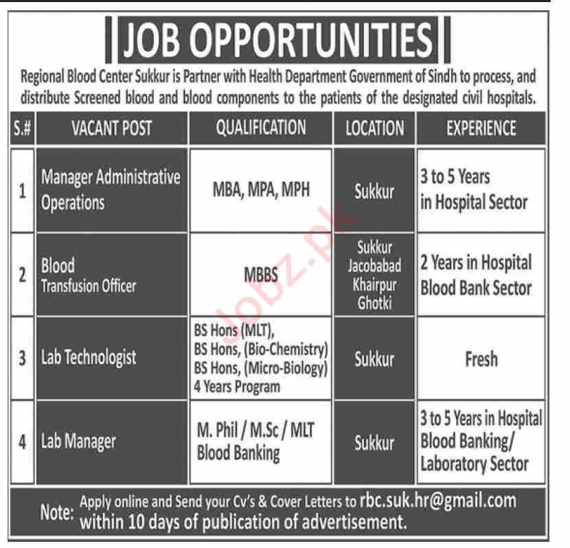 Regional Blood Center Sukkur, sukkur Sindh Pakistan invites applications from eligible candidates for the post of manager administrative operations, blood transfusion officer, lab technologist and lab manager as per advertisement of October 20, 2024 published in daily Dawn Newspaper. Persons with Mphil, MBBS, MBA and M.sc etc. education can apply.