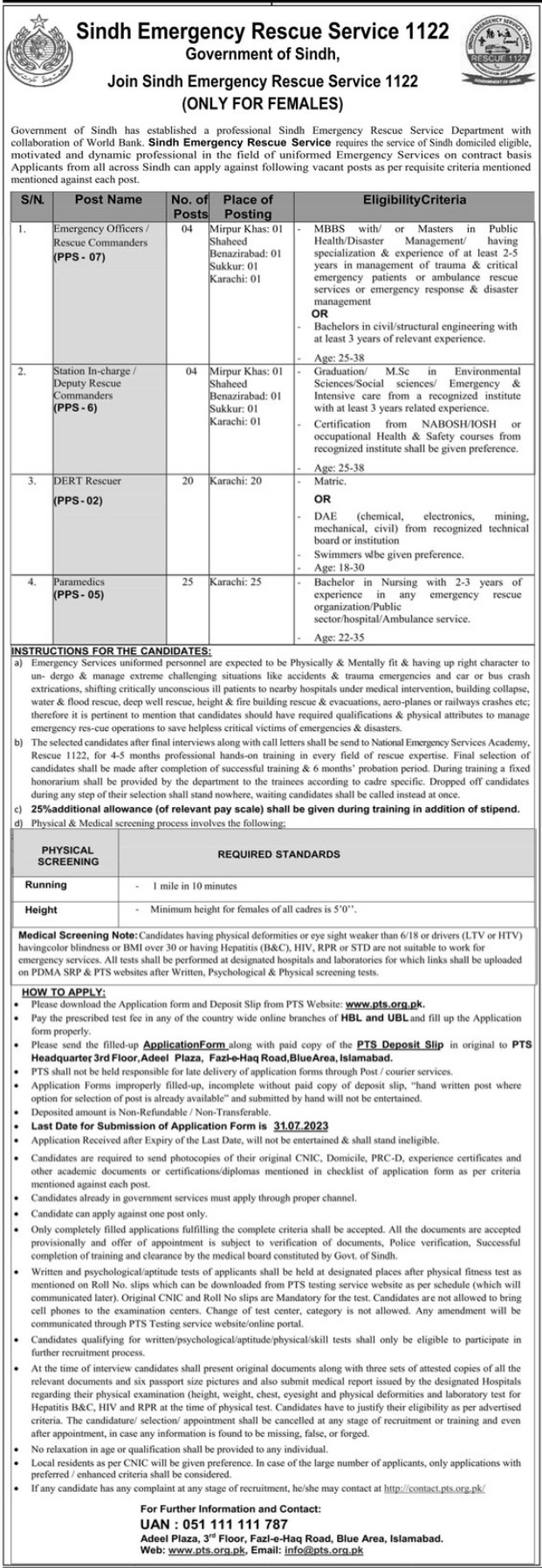 Sindh Emergency Rescue Service 1122 latest Government Management jobs and others can be applied till July 31, 2023 or as per closing date in newspaper ad. Read complete ad online via PTS to know how to apply on latest Sindh Emergency Rescue Service 1122 job opportunities.