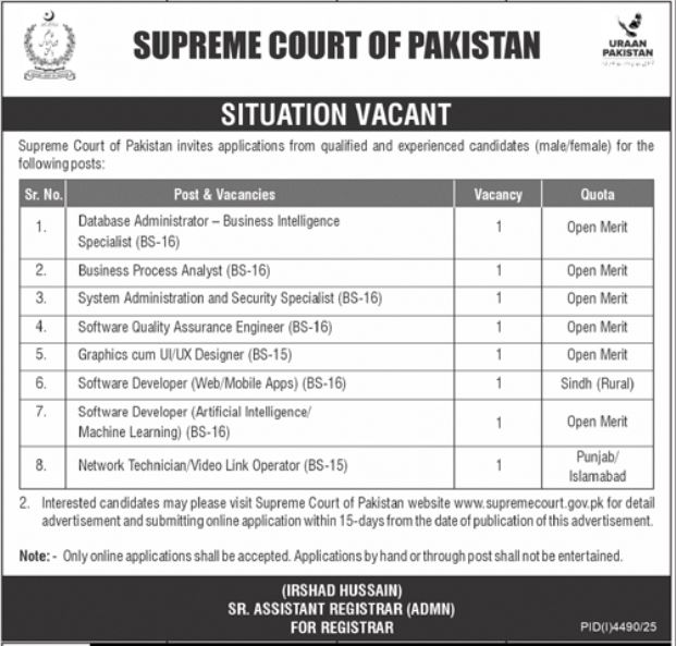 Supreme Court of Pakistan invites applications for job positions advertised in daily Jang dated 30 November 2025 for following vacancies in Islamabad, islamabad Islamabad Pakistan.
