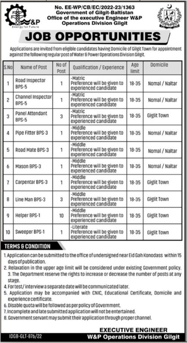 Water and Power Department Operations Division jobs advertisement dated about 4 November 2022 in daily K2 Newspaper invites application for the vacant post of panel attendant, carpenter, line man, road mate, mason, pipe fitter, road inspector, sweeper, channel inspector and helper in Gilgit, gilgit Gilgit Baltistan Pakistan. Candidates with Middle, Matric and Primary etc. educational background will be preferred.
