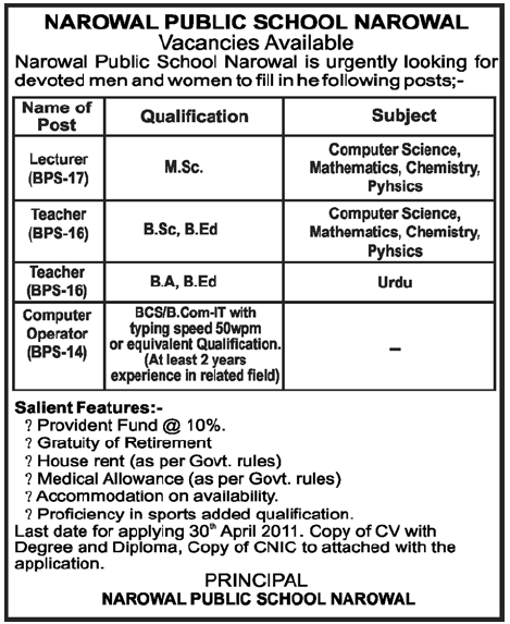 Vacancies In Narowal School