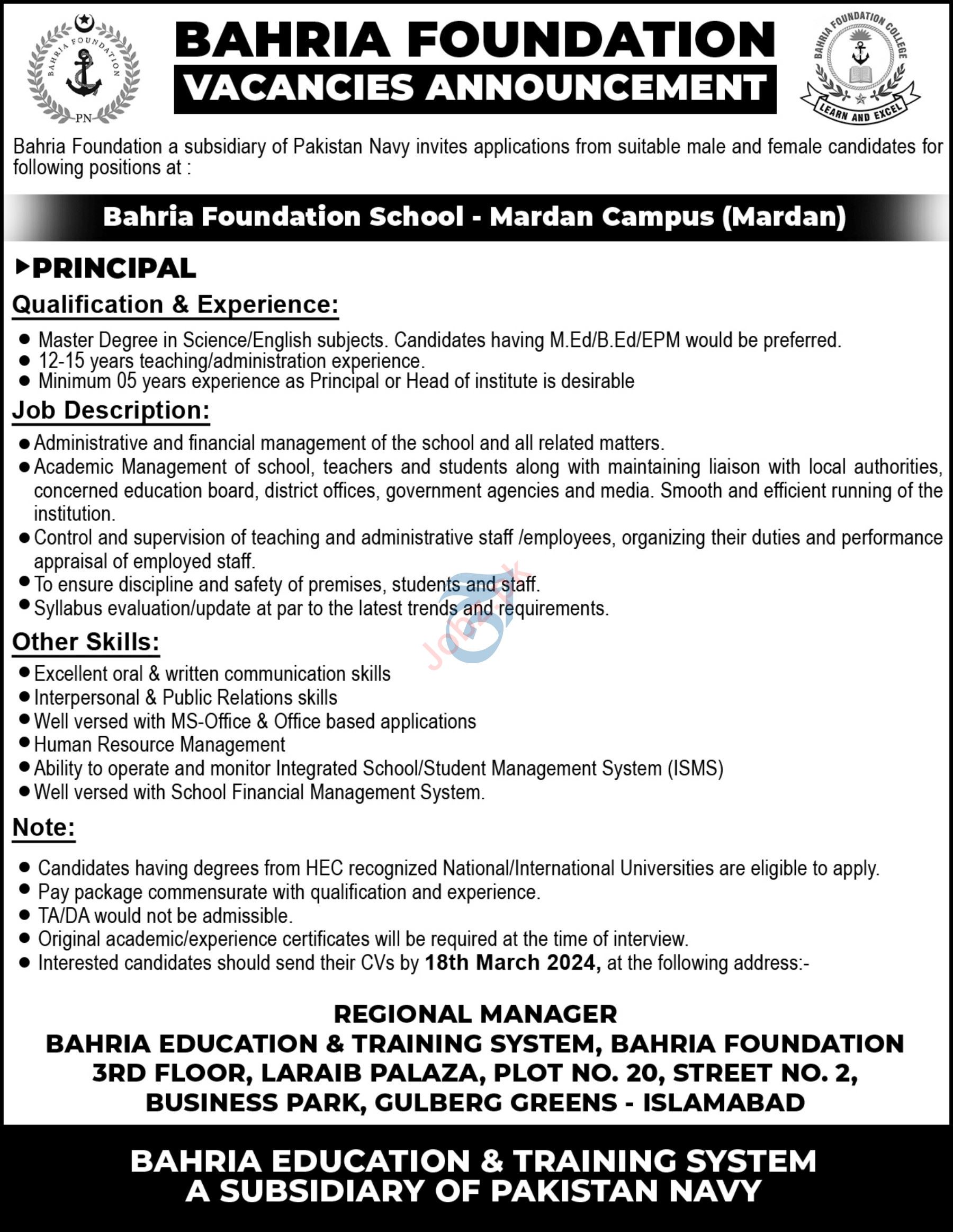 Bahria Foundation Schools BFS Mardan, mardan Khyber Pakhtunkhwa KPK Pakistan invites applications from eligible candidates for the post of principal as per advertisement of March 10, 2024 published in daily Aaj Newspaper. Master etc. educational qualification will be preferred.