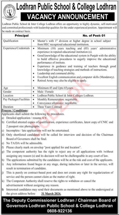 Vacancies in Lodhran Public School & College Advertisement March 2024