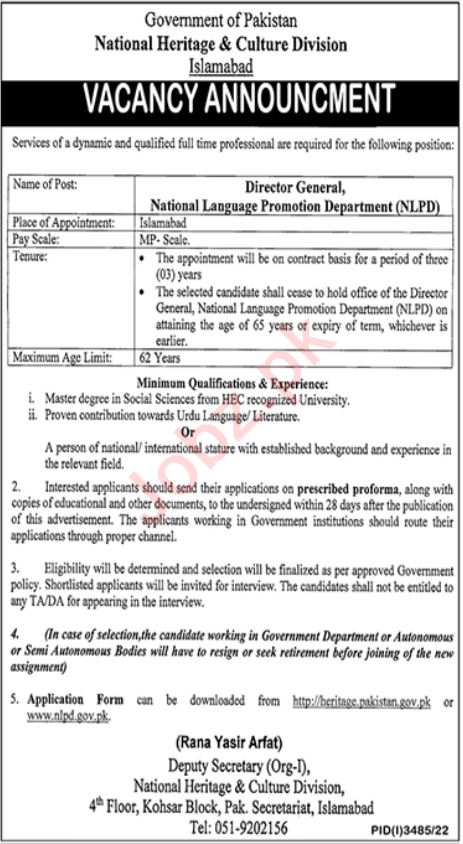 National Heritage & Culture Division invites applications for job positions advertised in daily Jang dated 4 December 2022 for following vacancies in Islamabad, islamabad Islamabad Pakistan.