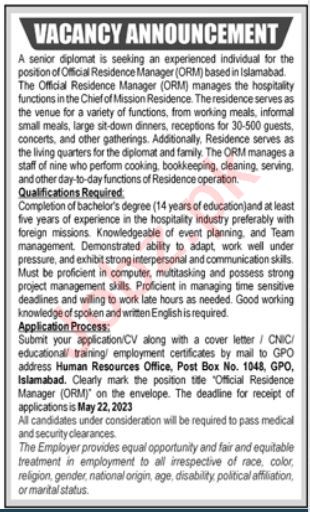 Vacant posts including official residence manager are announced in Public Sector Organization Islamabad, islamabad Islamabad Pakistan as per 7 May 2023 advertisement in daily Jang Newspaper. Bachelor etc. educational qualification will be preferred.