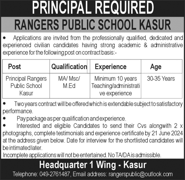 Rangers Public School Kasur, kasur Punjab Pakistan invites applications from eligible candidates for the post of principal as per advertisement of June 8, 2024 published in daily Nawaiwaqt Newspaper. Educational qualifications required M.ed, M.sc and MA etc.